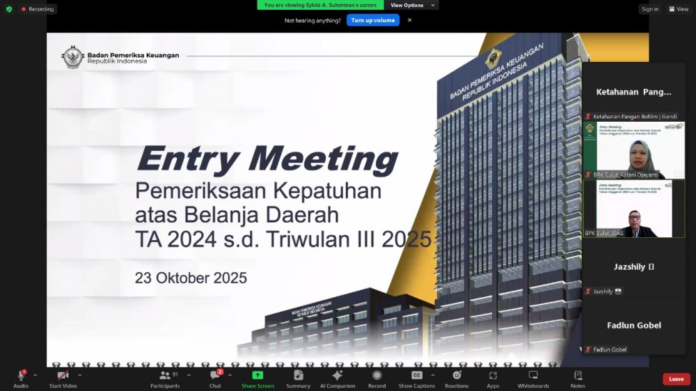 Dinas Ketahanan Pangan (DKP) Kabupaten Bolaang Mongondow Timur mengikuti kegiatan Entry Meeting Pemeriksaan Kepatuhan atas Belanja Daerah Tahun Anggaran 2024 sampai dengan Triwulan III Tahun 2025, yang dilaksanakan secara online pada Kamis, 23 Oktober 2025.